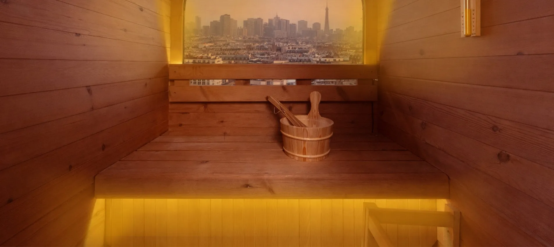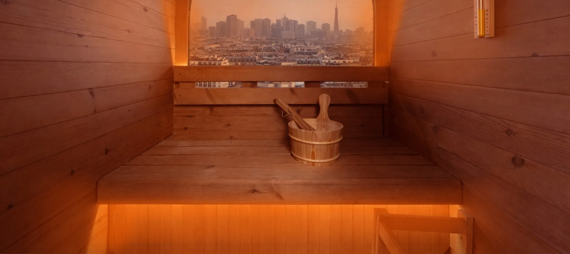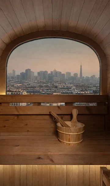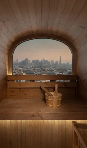 La vitre arrière en demi-lune structure le design du sauna COCOON et crée une véritable signature architecturale. Sa large surface vitrée apporte luminosité naturelle et sensation d’espace, tout en ouvrant la cabine sur l’extérieur. Intégrée avec précision dans la structure bois, elle combine esthétisme premium, confort visuel et expérience immersive, idéale en environnement urbain.