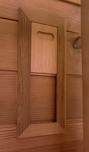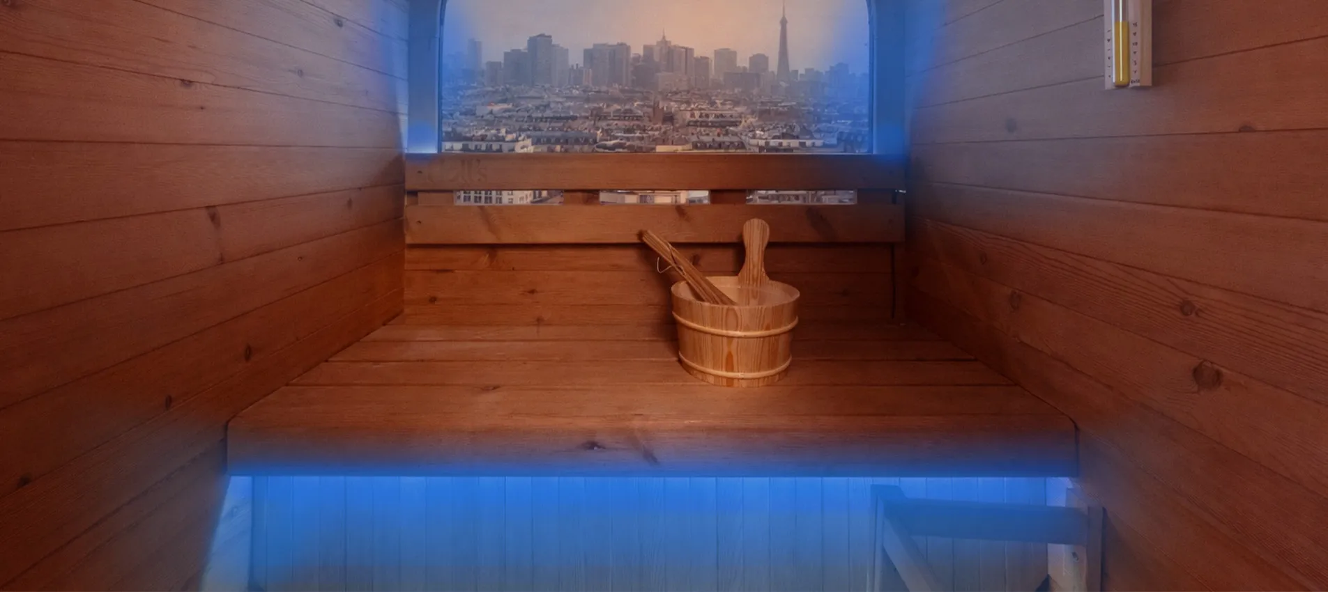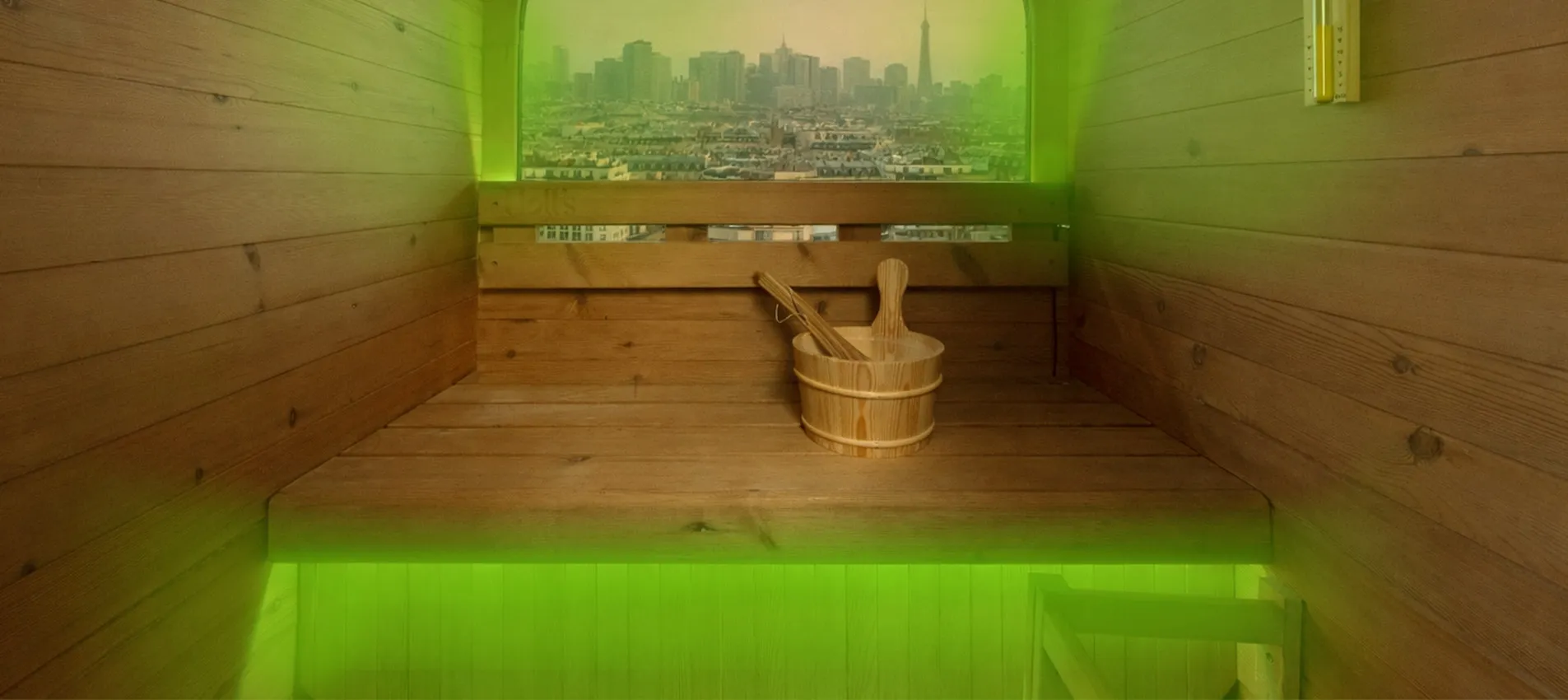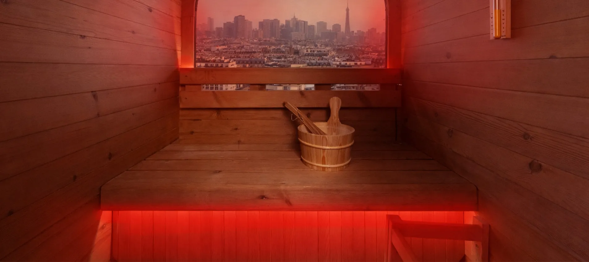 La vitre arrière en demi-lune structure le design du sauna COCOON et crée une véritable signature architecturale. Sa large surface vitrée apporte luminosité naturelle et sensation d’espace, tout en ouvrant la cabine sur l’extérieur. Intégrée avec précision dans la structure bois, elle combine esthétisme premium, confort visuel et expérience immersive, idéale en environnement urbain.